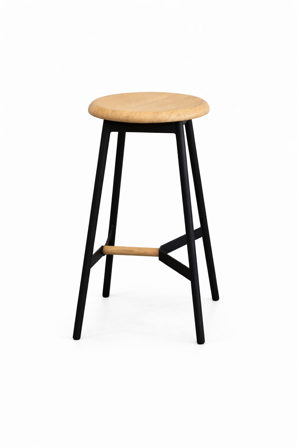 A minimalist bar stool featuring a round seat with a sleek 4 leg black metal frame. The design is clean and modern, with angled legs and a supportive crossbar footrest that adds both stability and visual interest.
