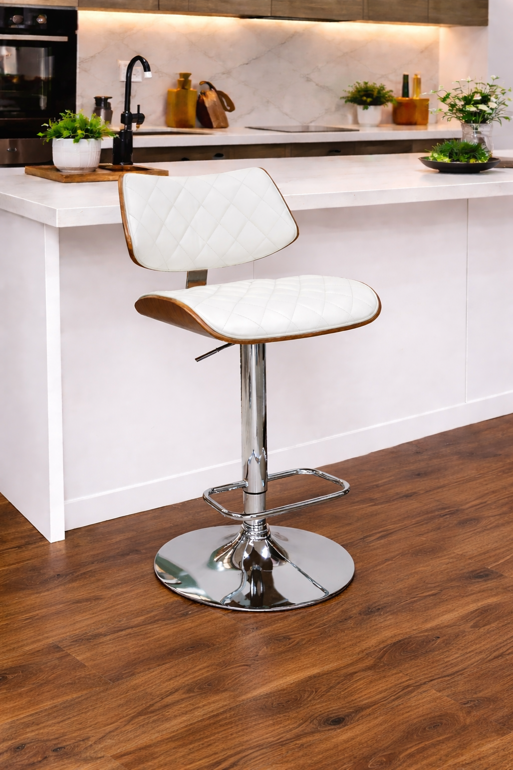 MATERIAL: Padded PU seat, Stitch pattern detail, Gaslift, Chrome round base