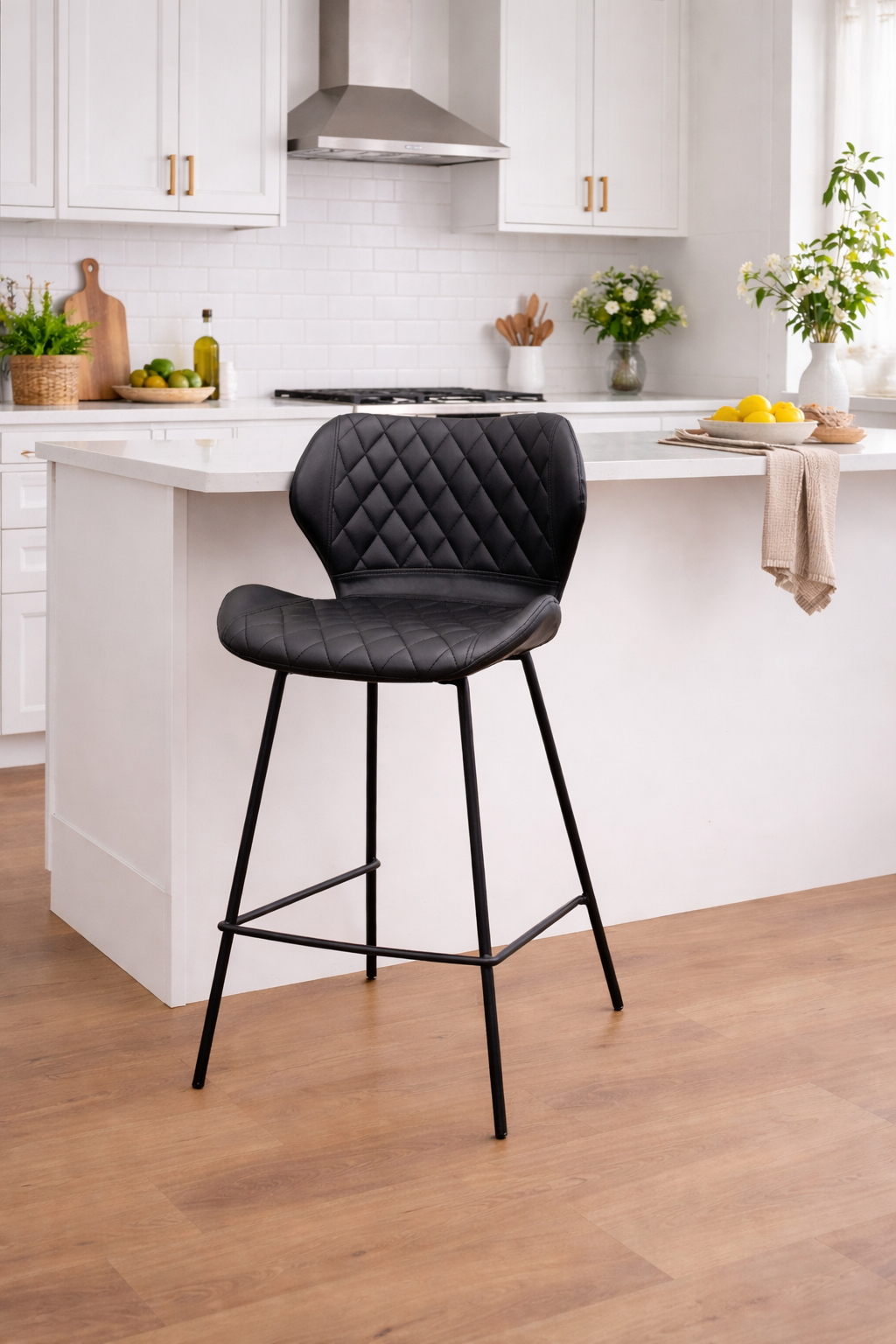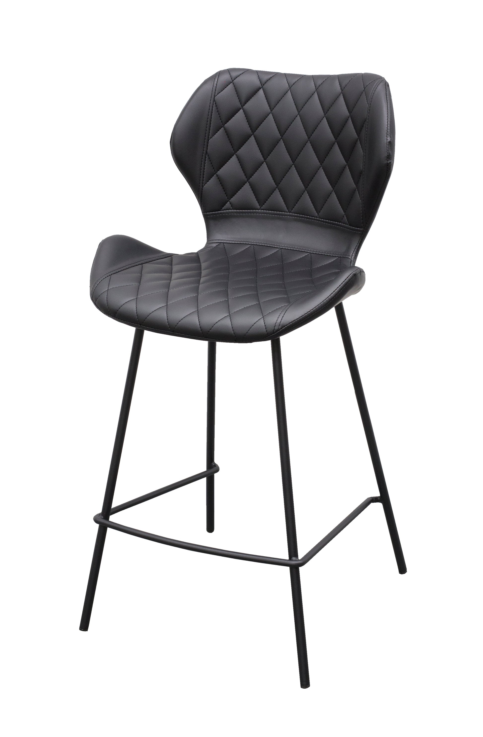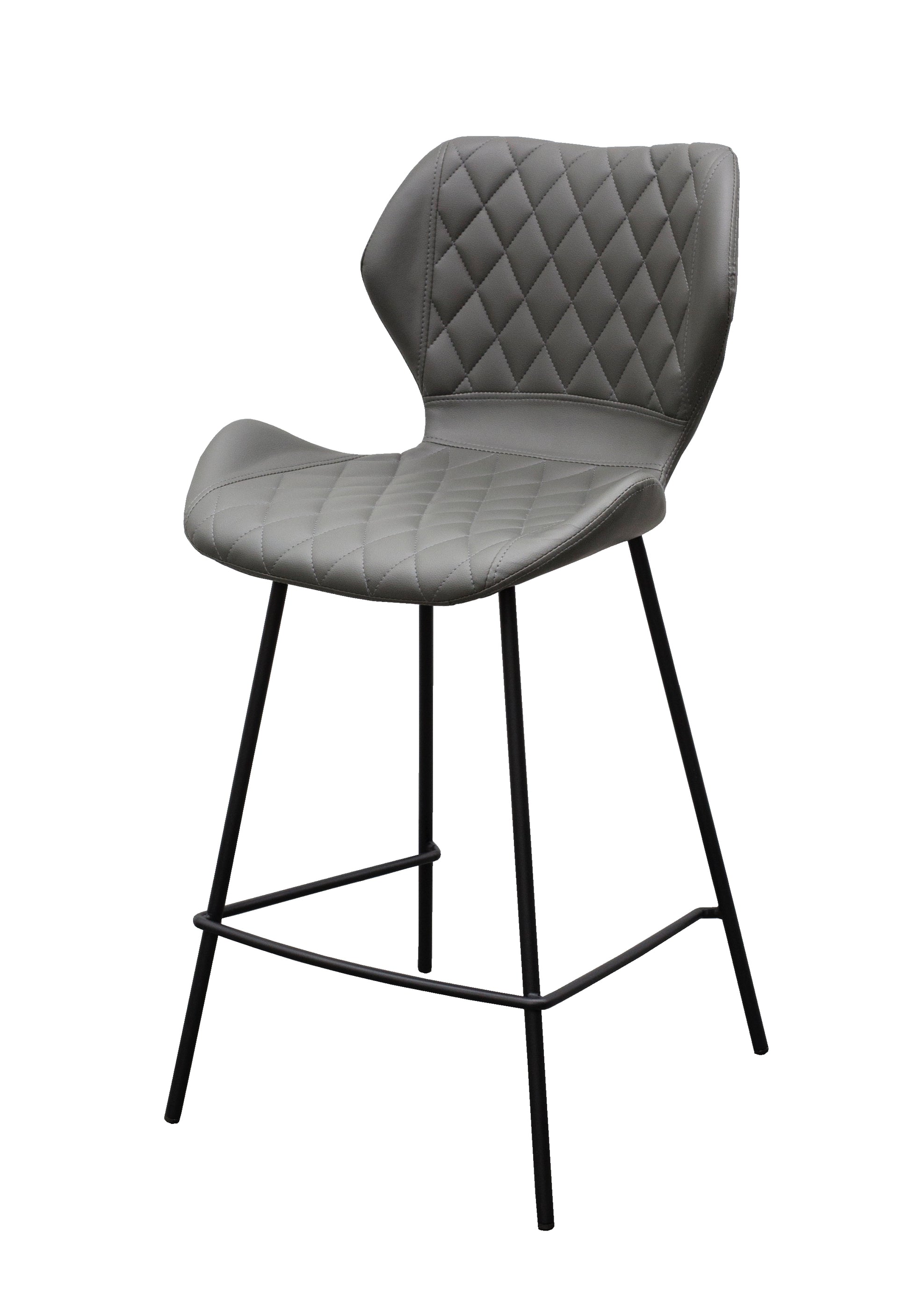 A modern bar stool featuring a quilted grey upholstered seat with a curved backrest, set on a sleek black metal frame.